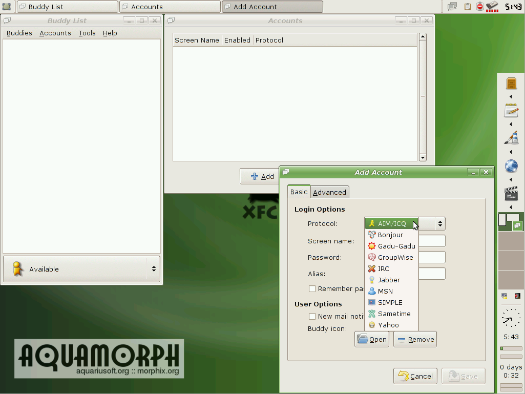 aquamorph version 0.4 has been released! Originally based on Morphix' Lightgui, aquamorph is a complete, up-to-date environment, in which the user can comfortably browse, program and generally just do his work, while not having to worry about configuring and installing things. It features programs like Mozilla's Firefox browser and Thunderbird e-mail client, X-Chat for IRC chatting, Gaim version 2 for Instant Messaging, Abiword and Gnumeric for doing office work, Wireshark [formerly Ethereal] for doing forensic research, Graveman for burning CDs/DVDs etc. It also packages some nice fonts and audio/video codecs. The Java 1.5 environment has been left out for space reasons, besides it still being non-Free.